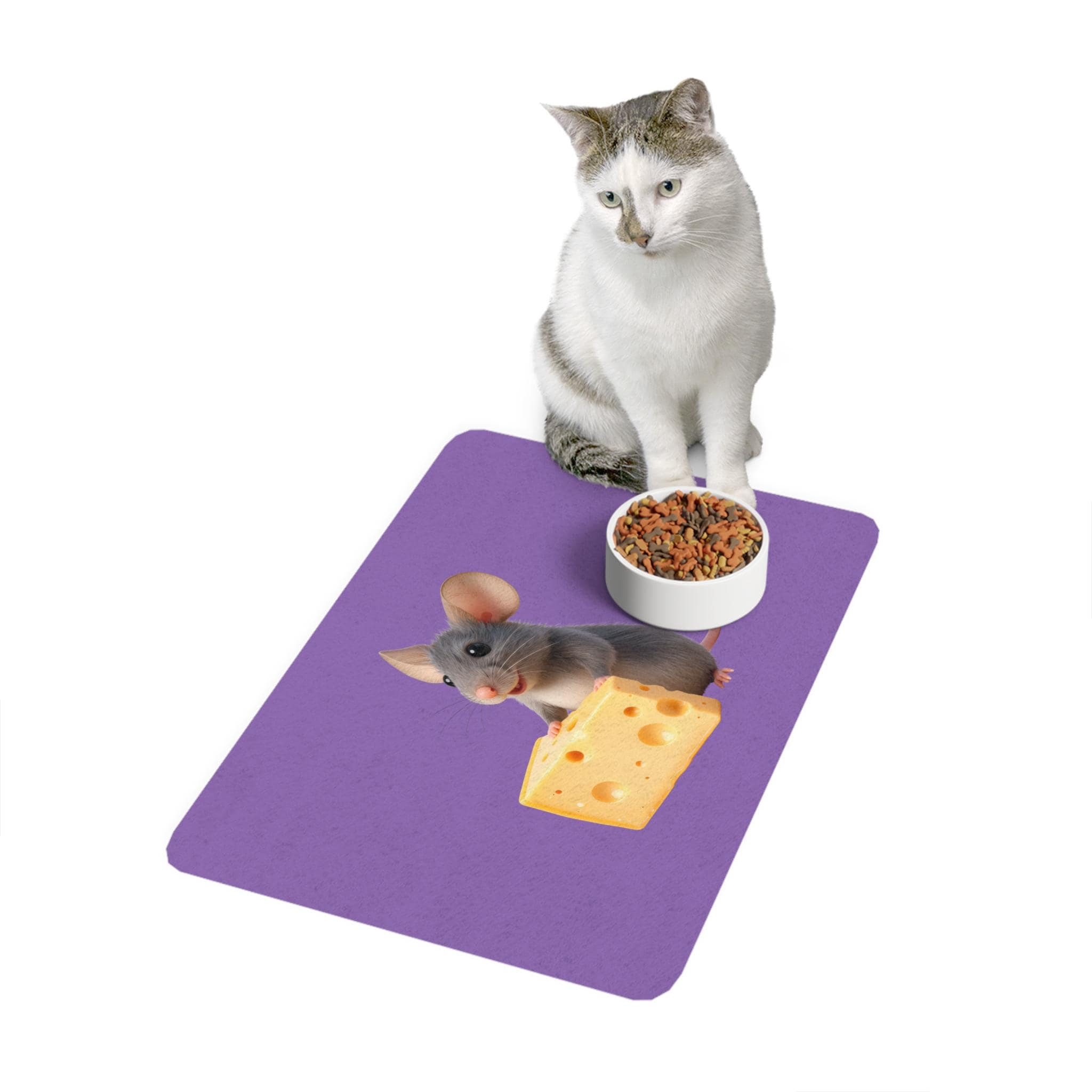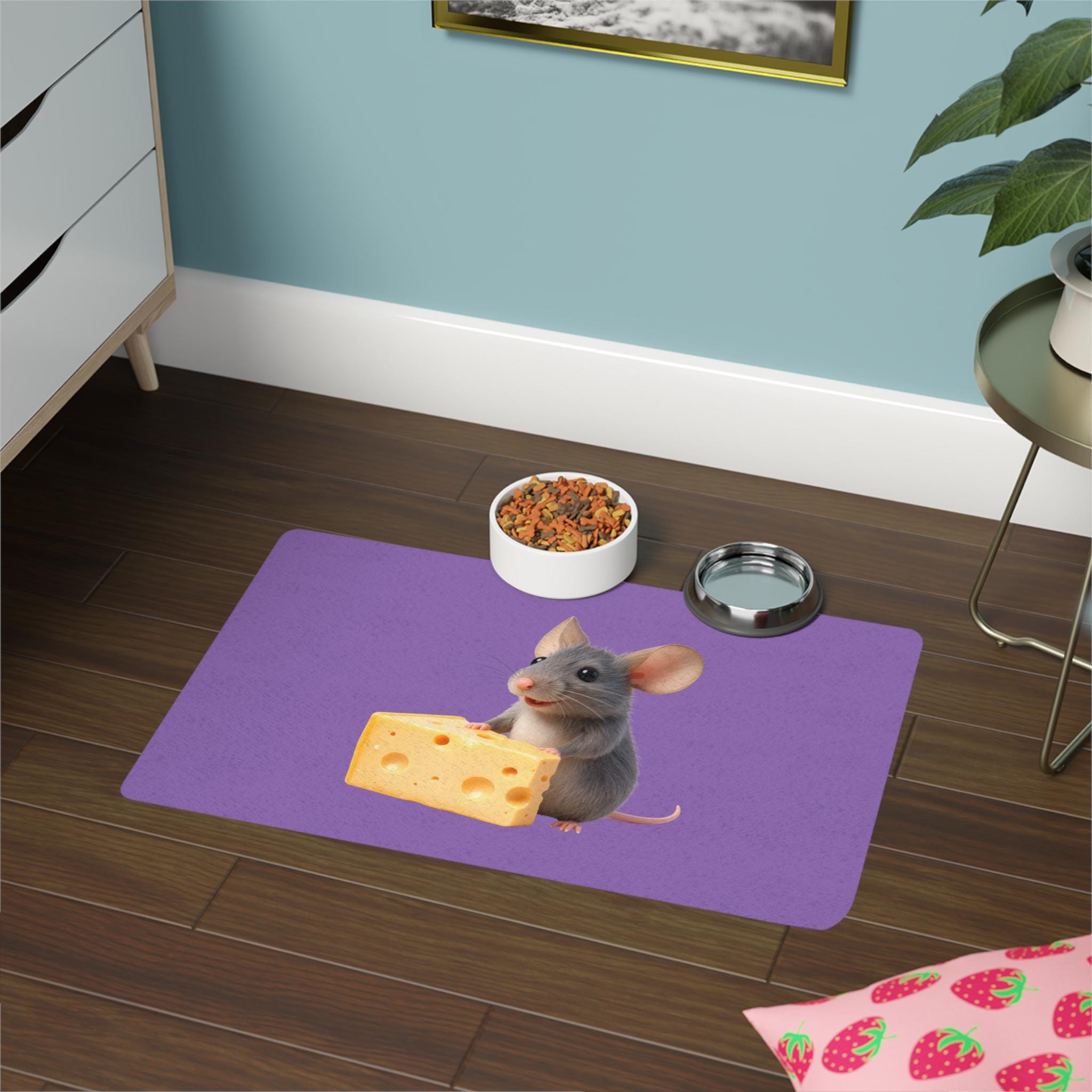 This soft, durable pet food mat brings a touch of playful charm to mealtime. A tiny, wide-eyed mouse clutching a wedge of cheese sits against a warm purple field — a cheerful scene that makes bowls feel like a little dining nook. The textured polyester surface resists stains and dries quickly, while the neoprene rubber backing holds the mat steady on tile or hardwood. Easy to clean and made to brighten everyday routines, it keeps floors protected from spills and splatters while giving your pet’s feeding area a sweet, whimsical personality.