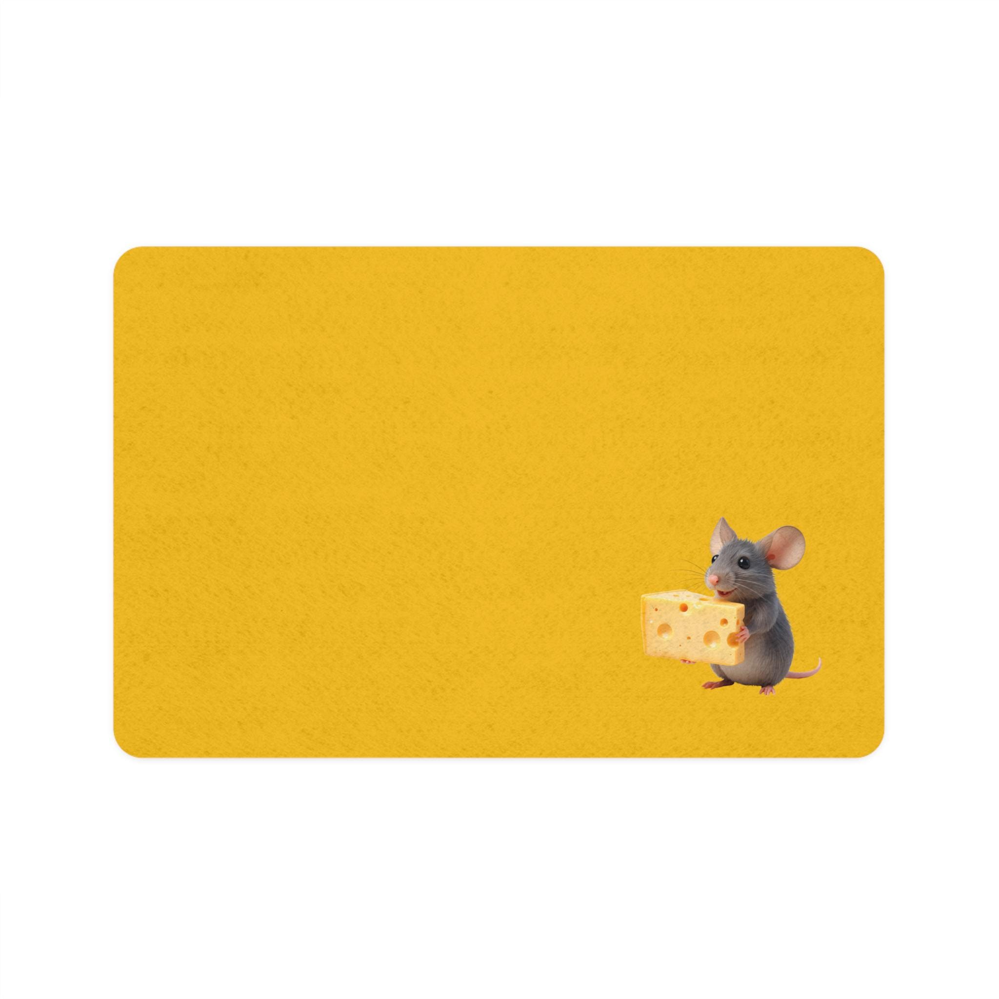 Bright, cheerful, and built for everyday use — this pet food mat brings a little delight to your pet’s feeding corner. A tiny, determined mouse carrying a wedge of cheese sits against a vivid golden field, adding a playful pop of color that hides splashes and crumbs. The textured polyester surface dries quickly and resists wear, while the neoprene backing grips the floor so bowls stay put. It’s simple, sweet, and made to keep mealtime tidy while lifting the mood of the room.