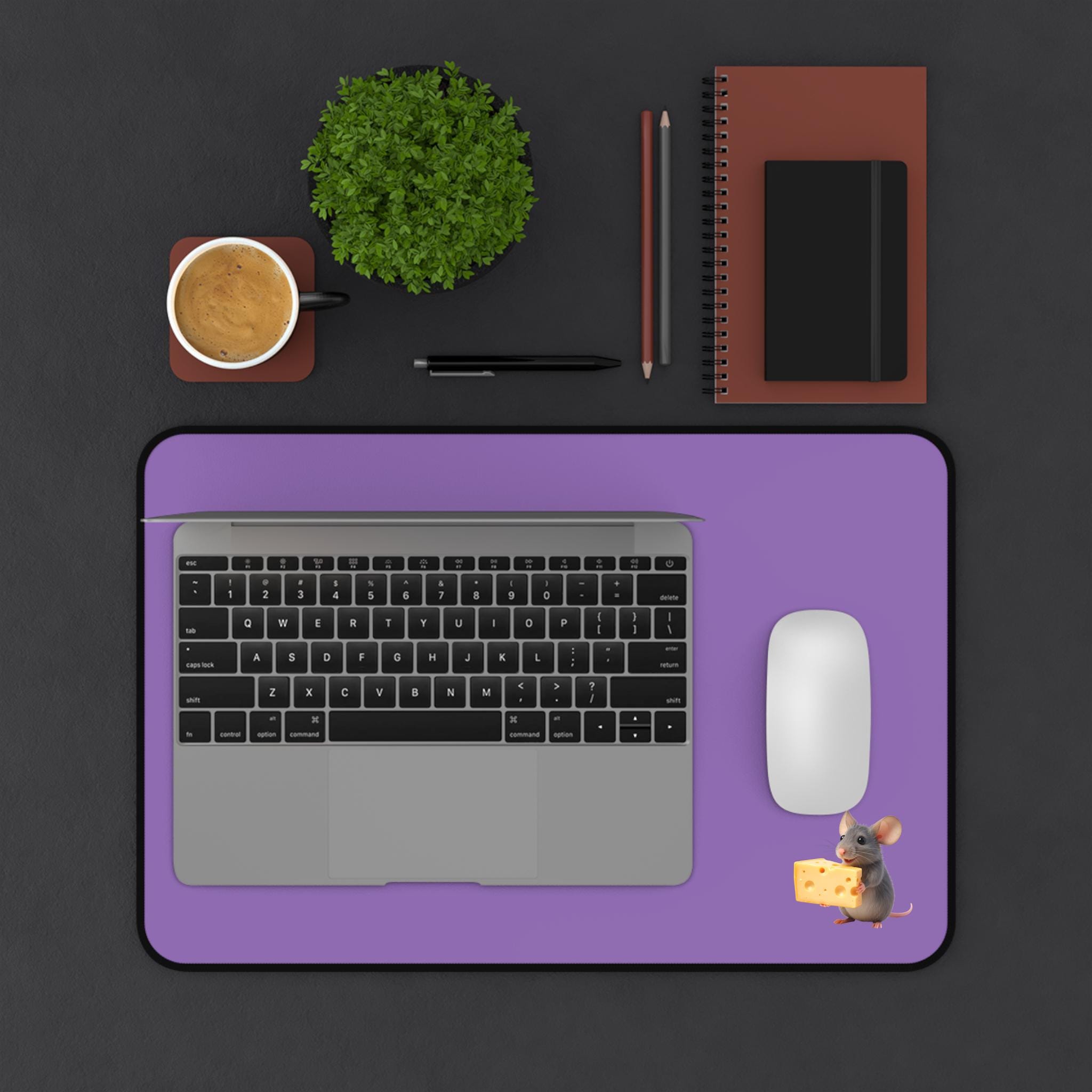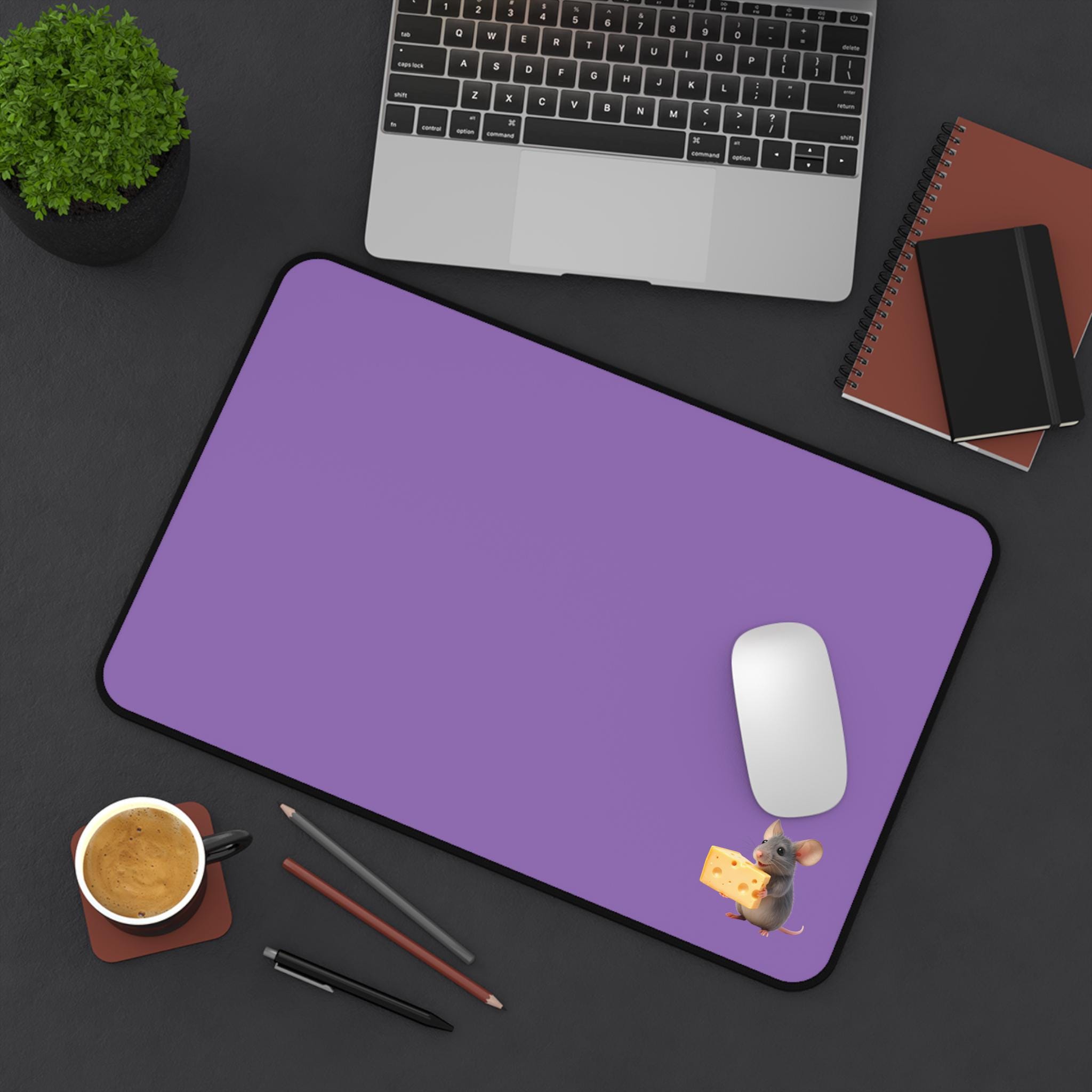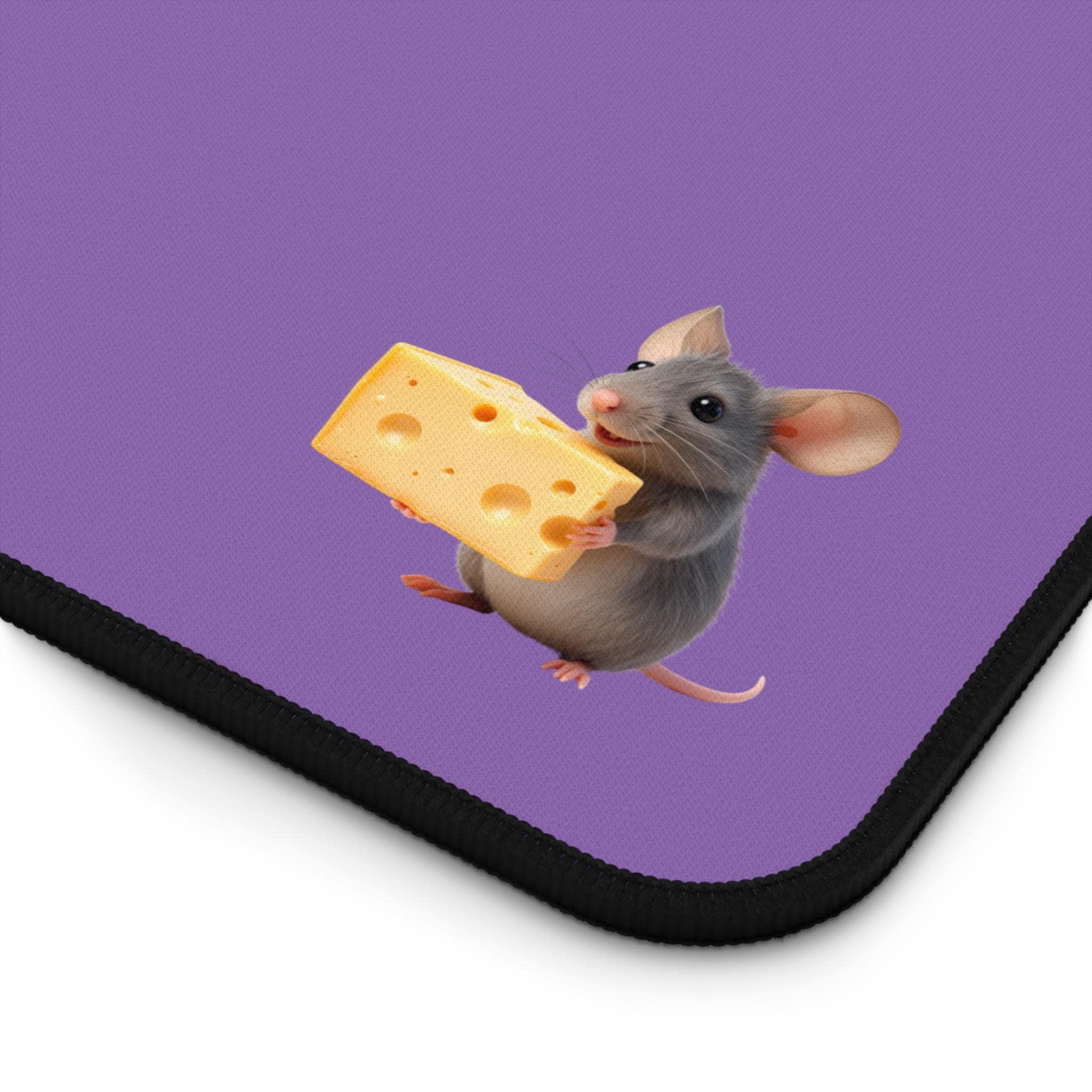 A soft, roomy neoprene desk mat that brings quiet charm to your workspace. The smooth surface slides pens and mice effortlessly while the stitched edges keep the design crisp day after day. A tiny mouse clutching a wedge of cheese peeks from the corner, adding a playful, warm accent to an otherwise calm, neutral background. It cushions your wrists during long typing sessions, protects tabletops from scratches and spills, and stays firmly in place thanks to its anti-slip backing. Available in three sizes to suit laptop nooks, full desks, or crafting stations—this mat turns everyday work into a little moment of delight.