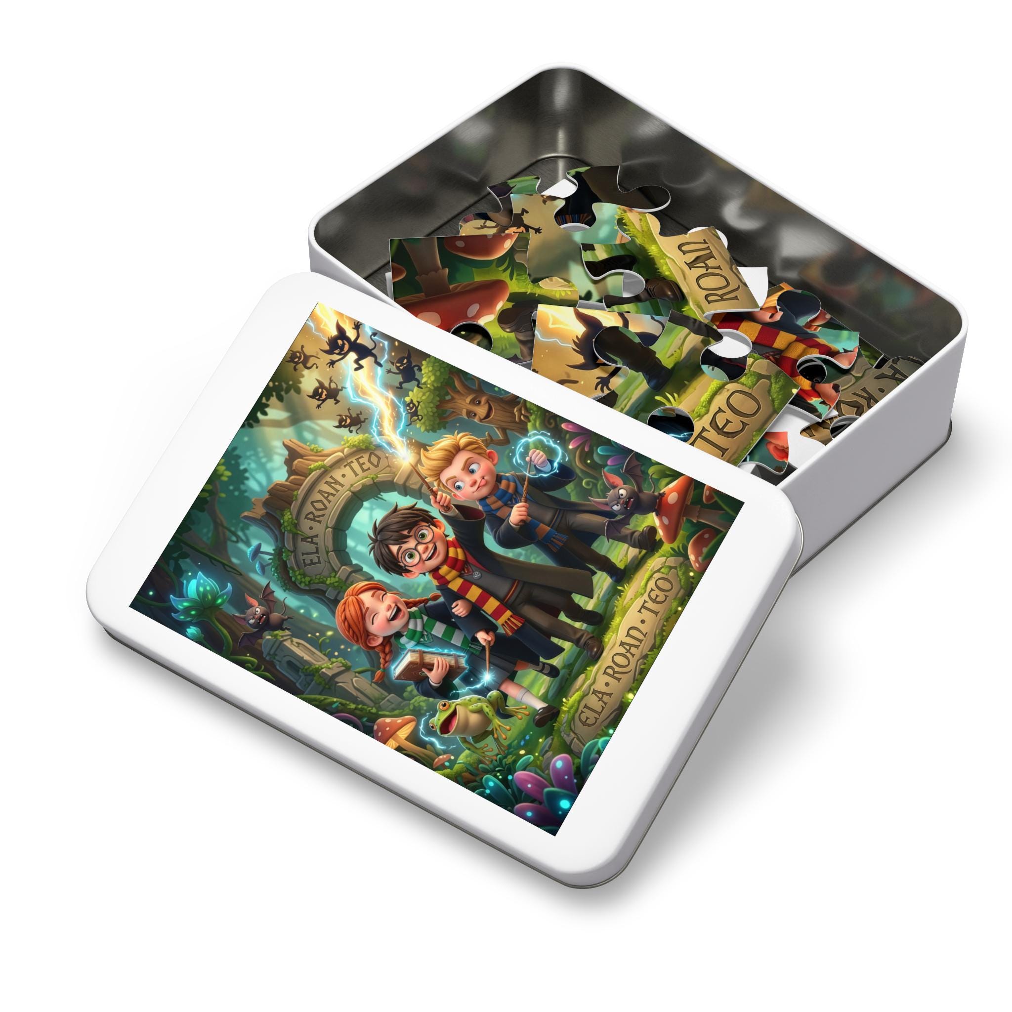 Bring a little wonder to rainy afternoons and cozy nights with this collectible tin puzzle. Hand-pressed pieces snap together with a satisfying click, revealing a whimsical forest scene full of curious characters, glowing flora, and secret paths. The glossy print keeps colors rich and magical as you work through the details — from twinkling mushrooms to the carved stone arch — so every completed moment feels rewarding. The sturdy white metal tin keeps loose pieces safe between sessions and displays the finished artwork on its lid, making it feel like a tiny gallery for your shelf. It’s the kind of puzzle that invites slow, focused play and sparks conversation around every surprising detail.