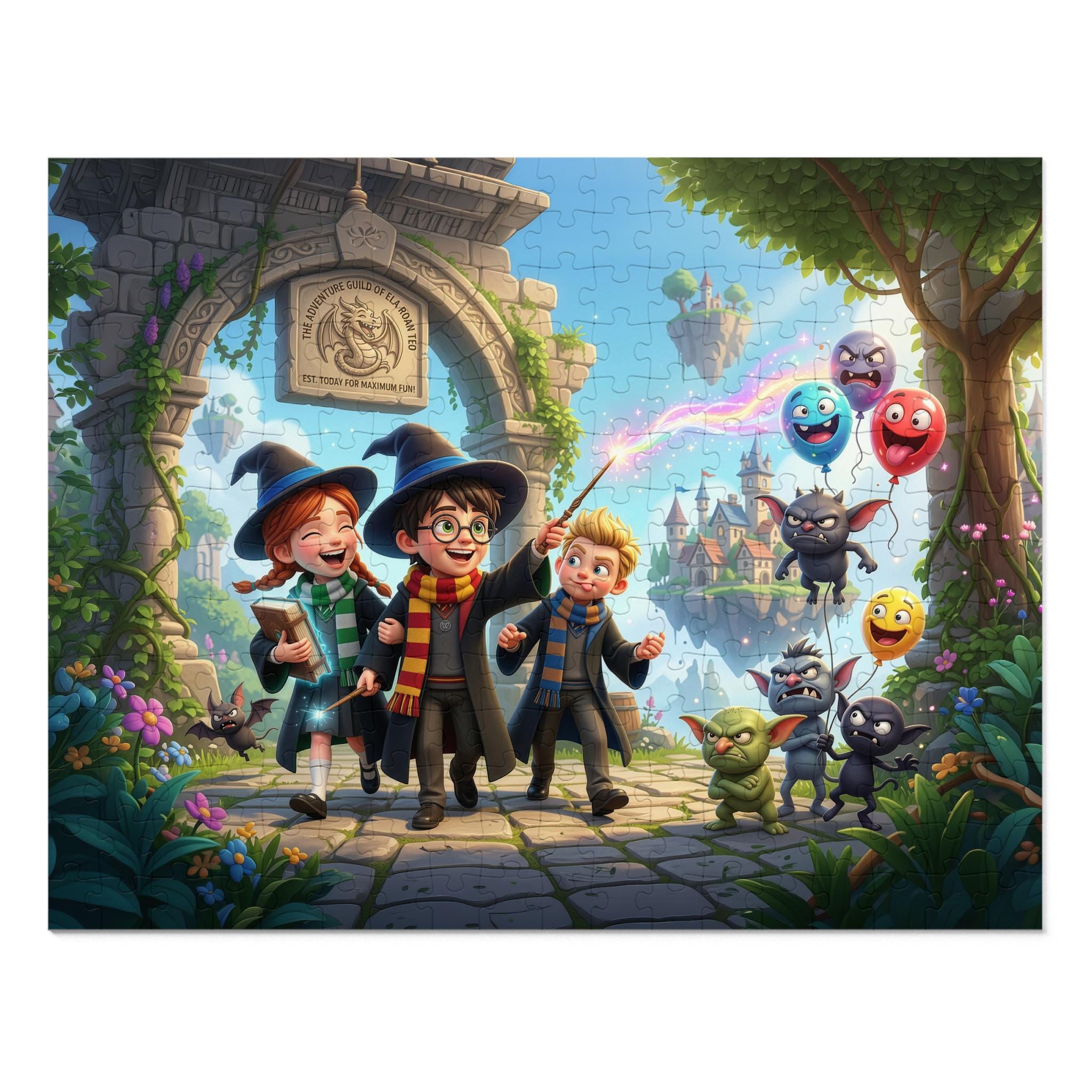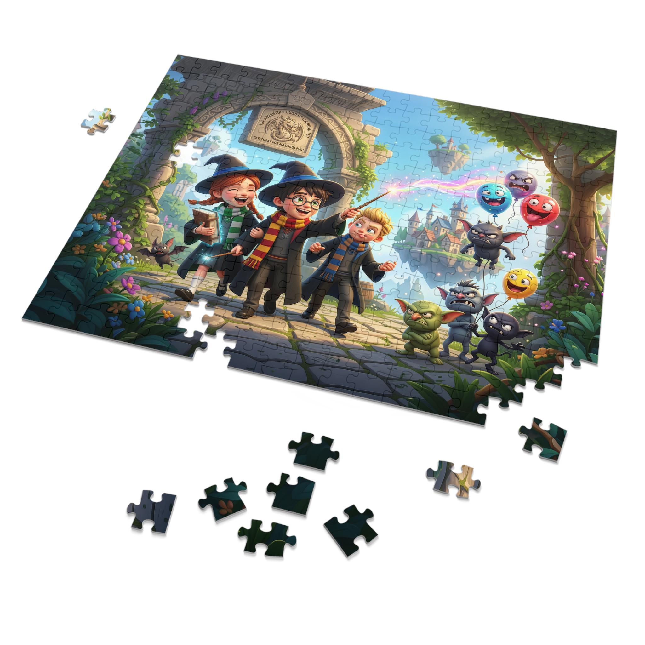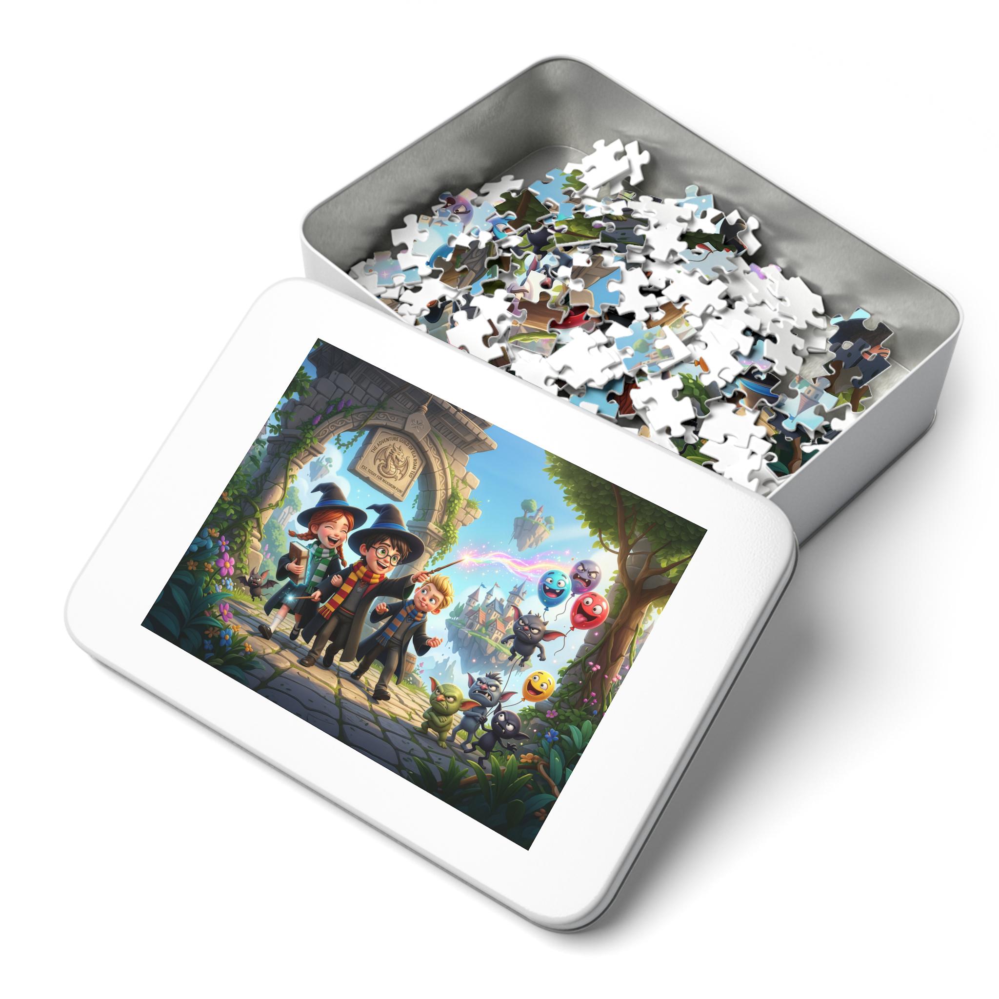 Bring storybook magic to your table with this high-quality jigsaw puzzle presented in a white metal tin. Bright, glossy printing brings every whimsical detail to life — from smiling young apprentices and floating castle isles to mischievous creatures and a ribbon of rainbow light. The finished image also appears on the tin and box so you can work from the full illustration or keep it as a colorful keepsake. Heavy chipboard pieces interlock precisely for a satisfying fit, and the glossy finish makes colors pop while helping pieces glide together. Choose from multiple piece counts to match the mood: a quick 30-piece activity, mid-length 500-piece evening, or an immersive 1000- or 2000-piece challenge. This puzzle fits into cozy nights, family game sessions, and anyone who treasures whimsical fantasy scenes.