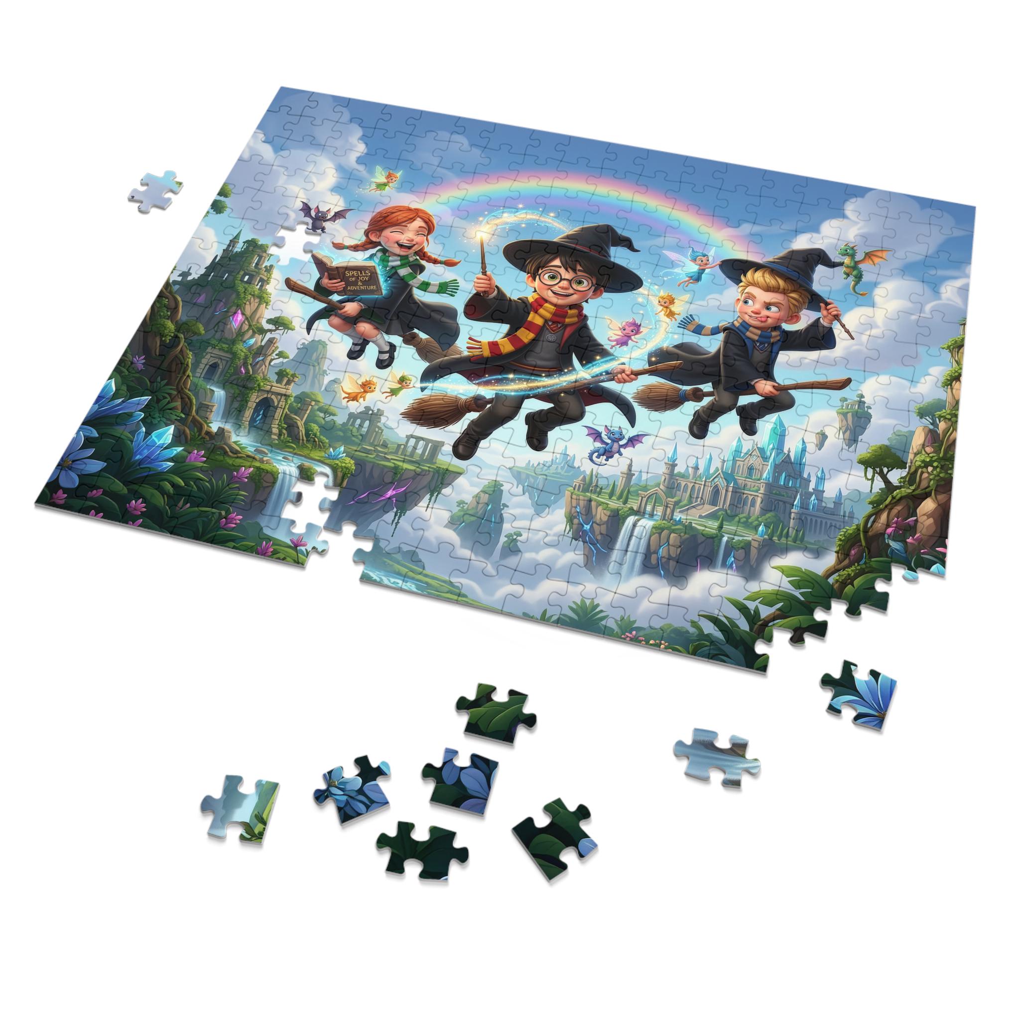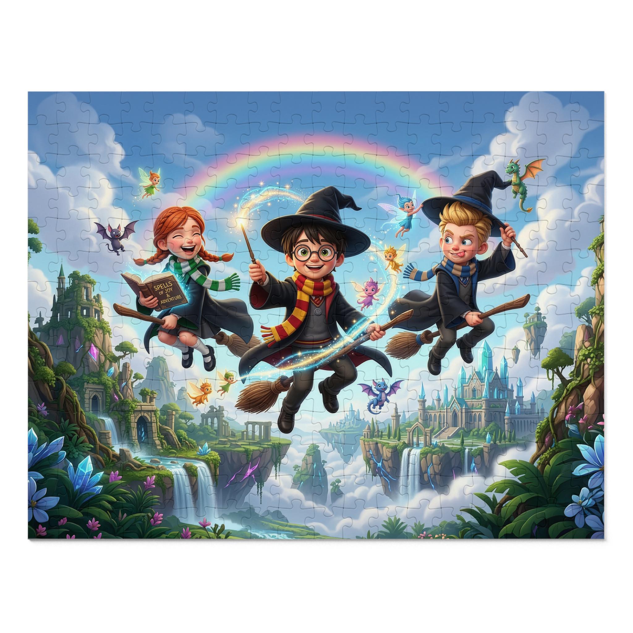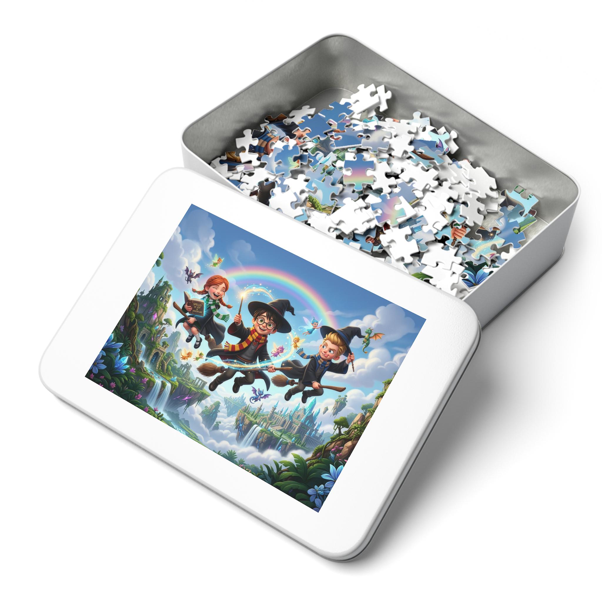Float into a world of wonder with this high-quality jigsaw puzzle and matching tin. Bright, glossy printing brings the whimsical scene to life — three young witches and wizards soaring on broomsticks over cascading waterfalls, dreamy castles, and a glowing rainbow. Each piece snaps together cleanly on sturdy chipboard, so assembling becomes a playful ritual that unravels details: tiny dragons, fluttering petals, and hidden corners of the enchanted landscape. When finished, the completed image is ready for display, and the white metal tin (with the same artwork on its lid) keeps pieces safe between sessions or travels with you to family game nights. The included box shows the full design to guide your build, while the durable glossy finish keeps colors vivid puzzle after puzzle.