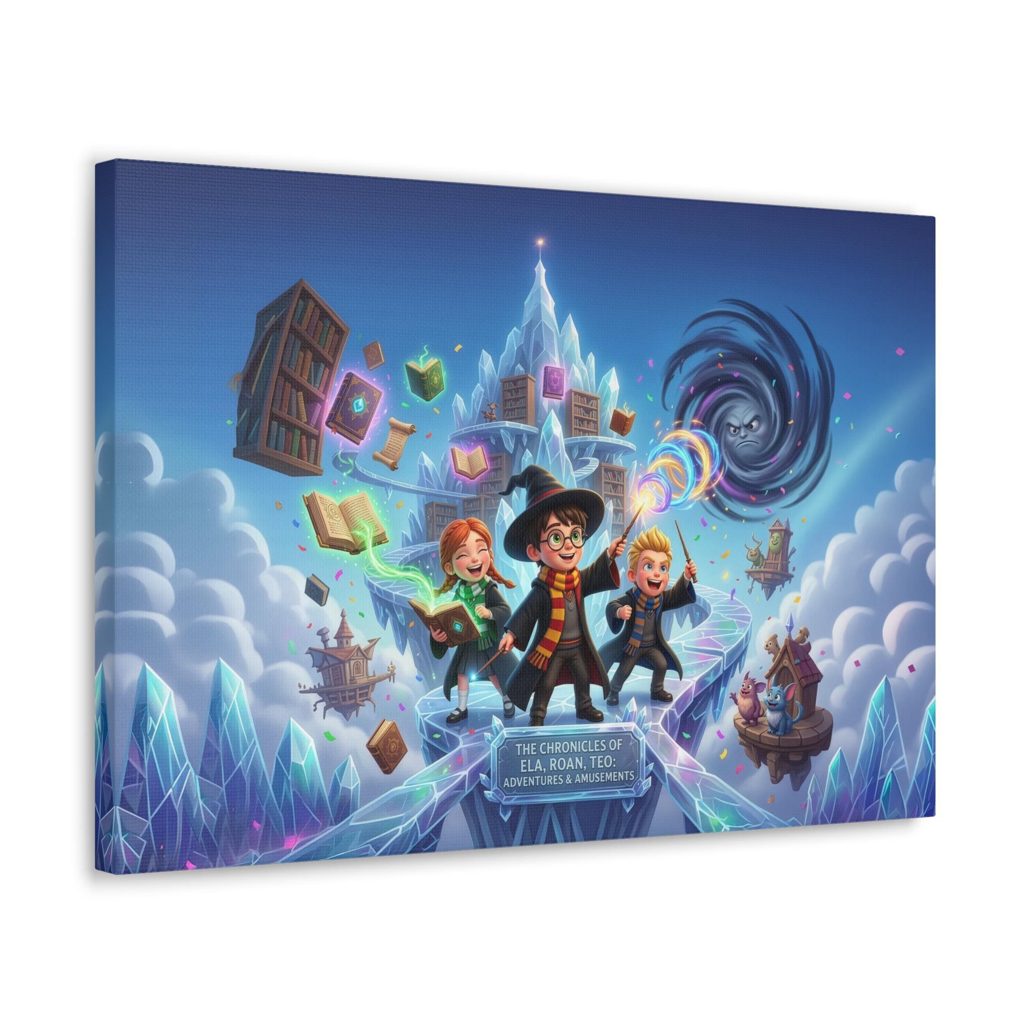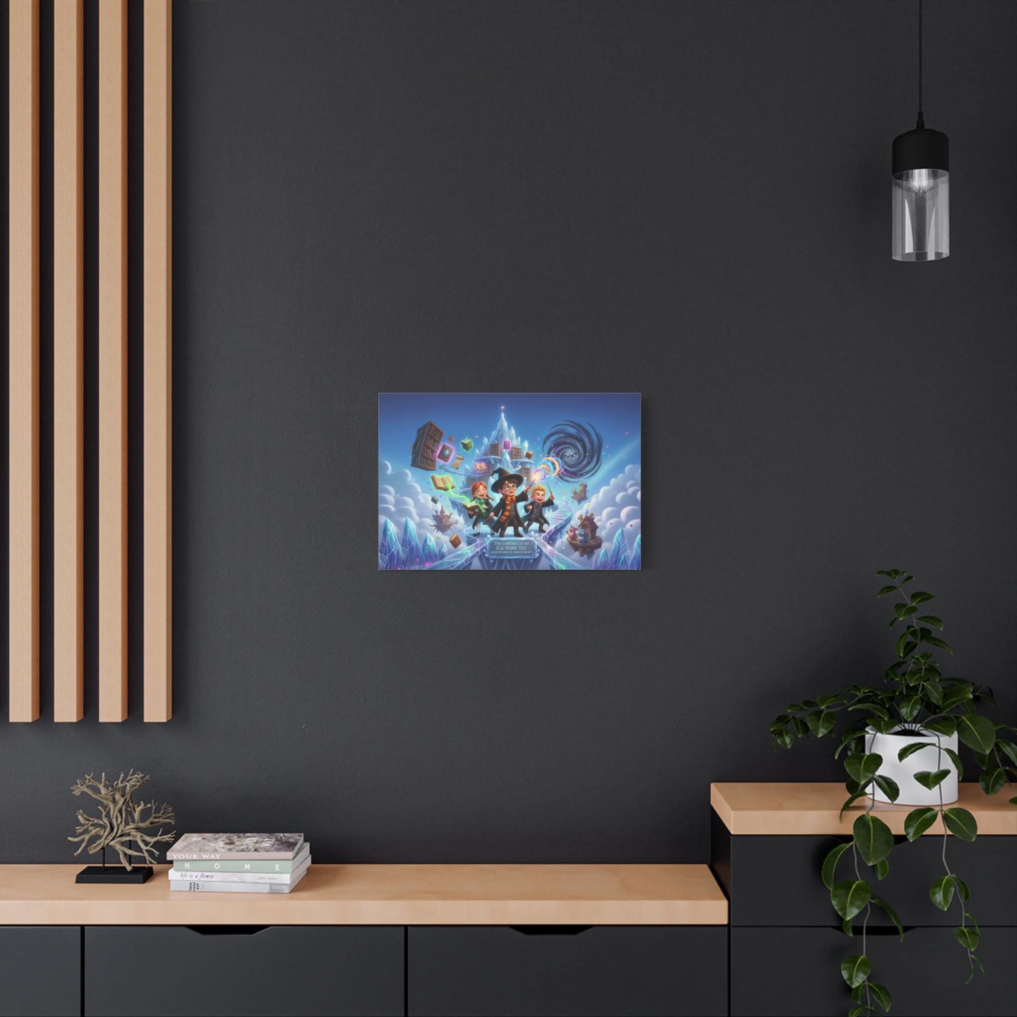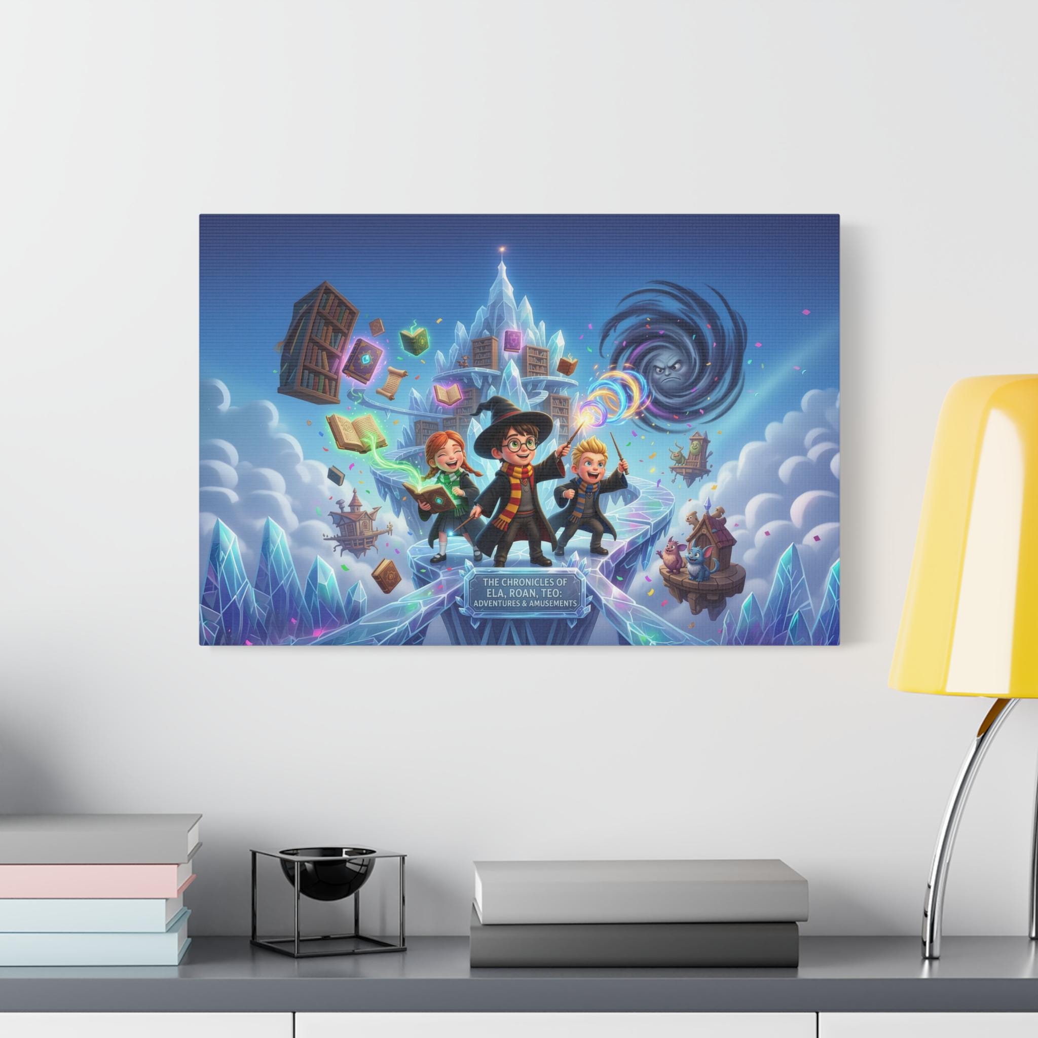 This satin-finish canvas brings whimsical adventure and vibrant color to any room. Printed on high-quality polycotton and stretched over a New Zealand pinewood frame, the scene pops with crisp detail and luminous hues — like a snapshot of magic caught mid-flight. The semi-gloss surface smooths light for a lively yet refined look, and the included self-assembly kit makes hanging straightforward. Choose from multiple orientations and sizes to suit a bedroom, game room, or creative studio; the sturdy wood frame and fade-resistant inks ensure the piece stays vivid through years of storytelling and play.