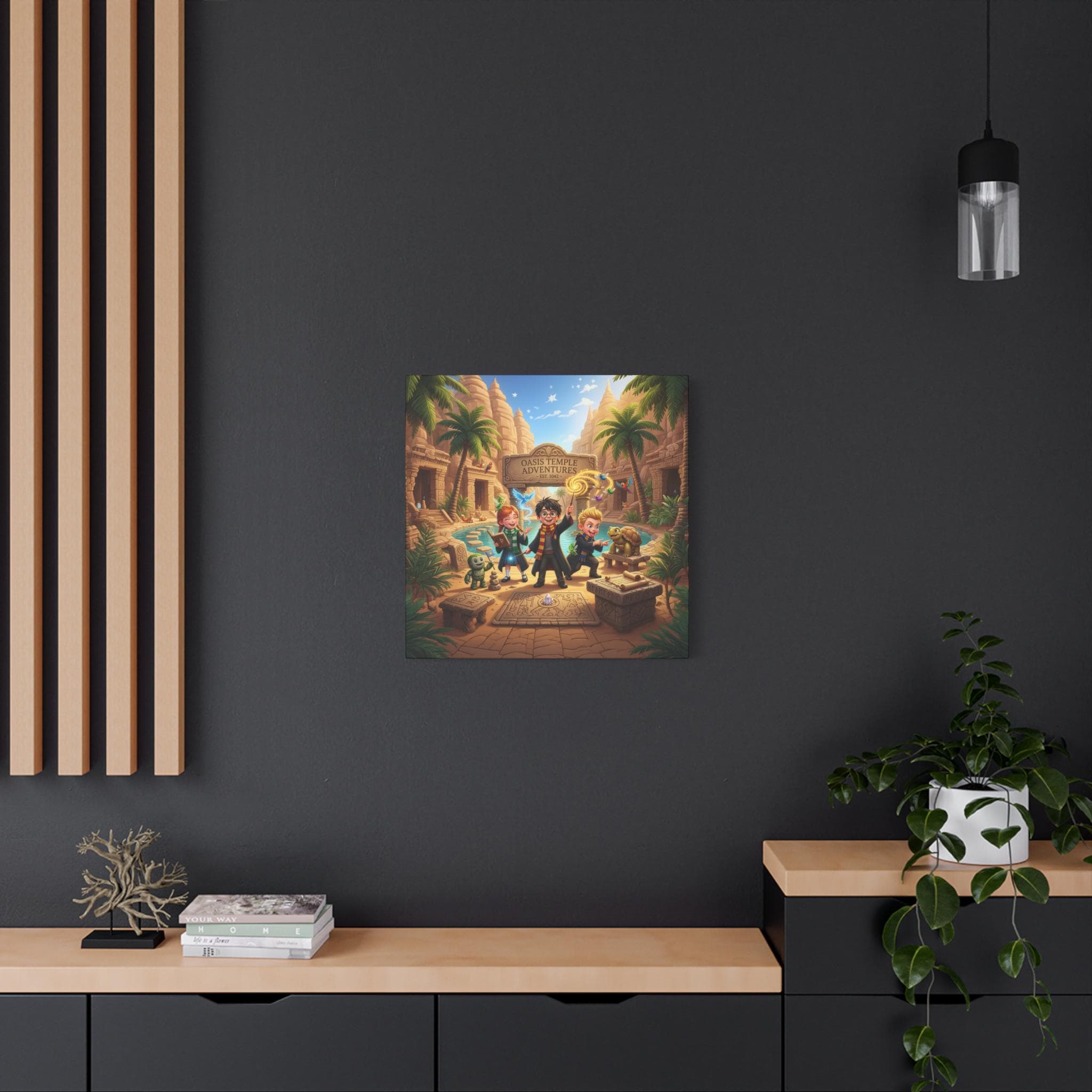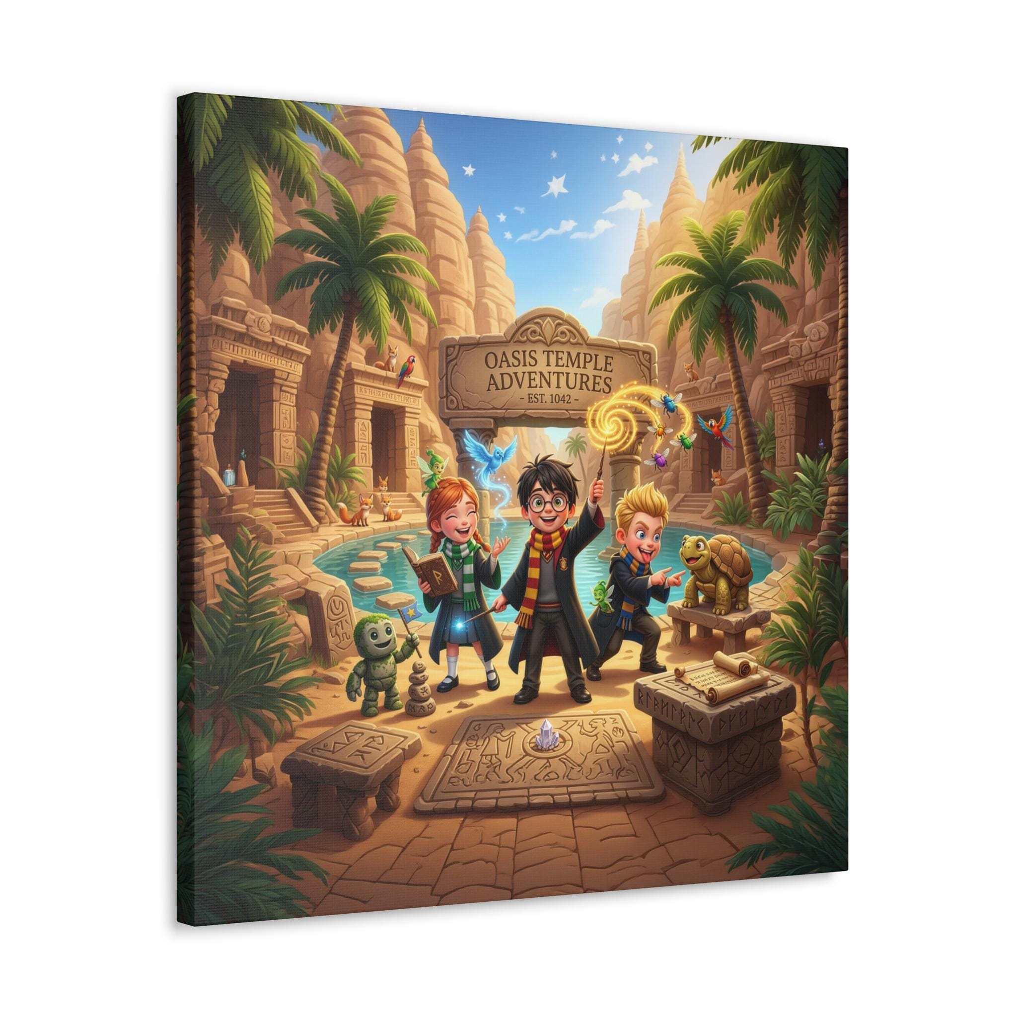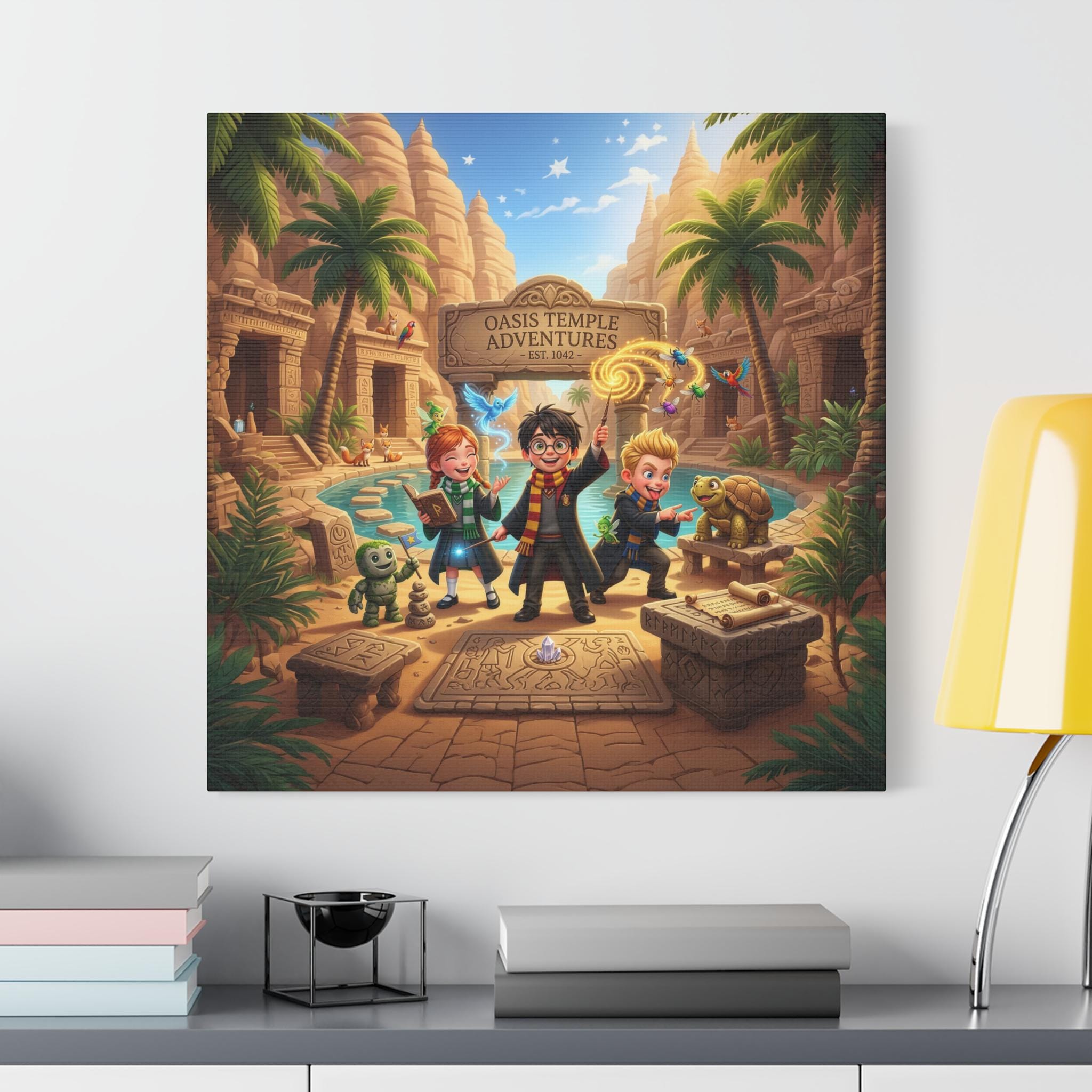 This handcrafted canvas brings a playful, storybook energy to any wall. Printed on high-quality polycotton with a subtle semi-gloss satin finish, the artwork’s bright, crisp colors and rich details pop — from the sunlit temple cliffs to the mischievous characters exploring the oasis. Mounted on a New Zealand pinewood frame and available in multiple orientations and sizes, the piece arrives with a simple self-assembly hanging kit so you can place it right where it will spark imagination: a playroom wall, a reading nook, or above a desk where adventures begin. Let this canvas set a scene of wonder and curiosity — a small portal to stories, quests, and afternoons spent pretending you’re the hero of your own tale.