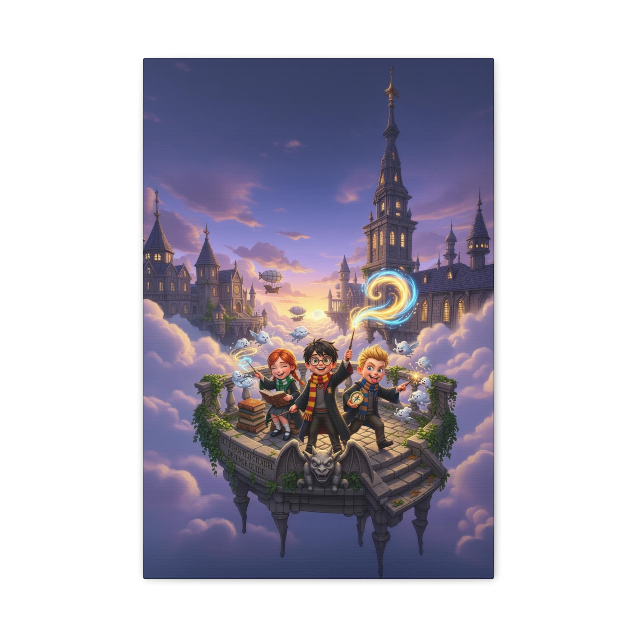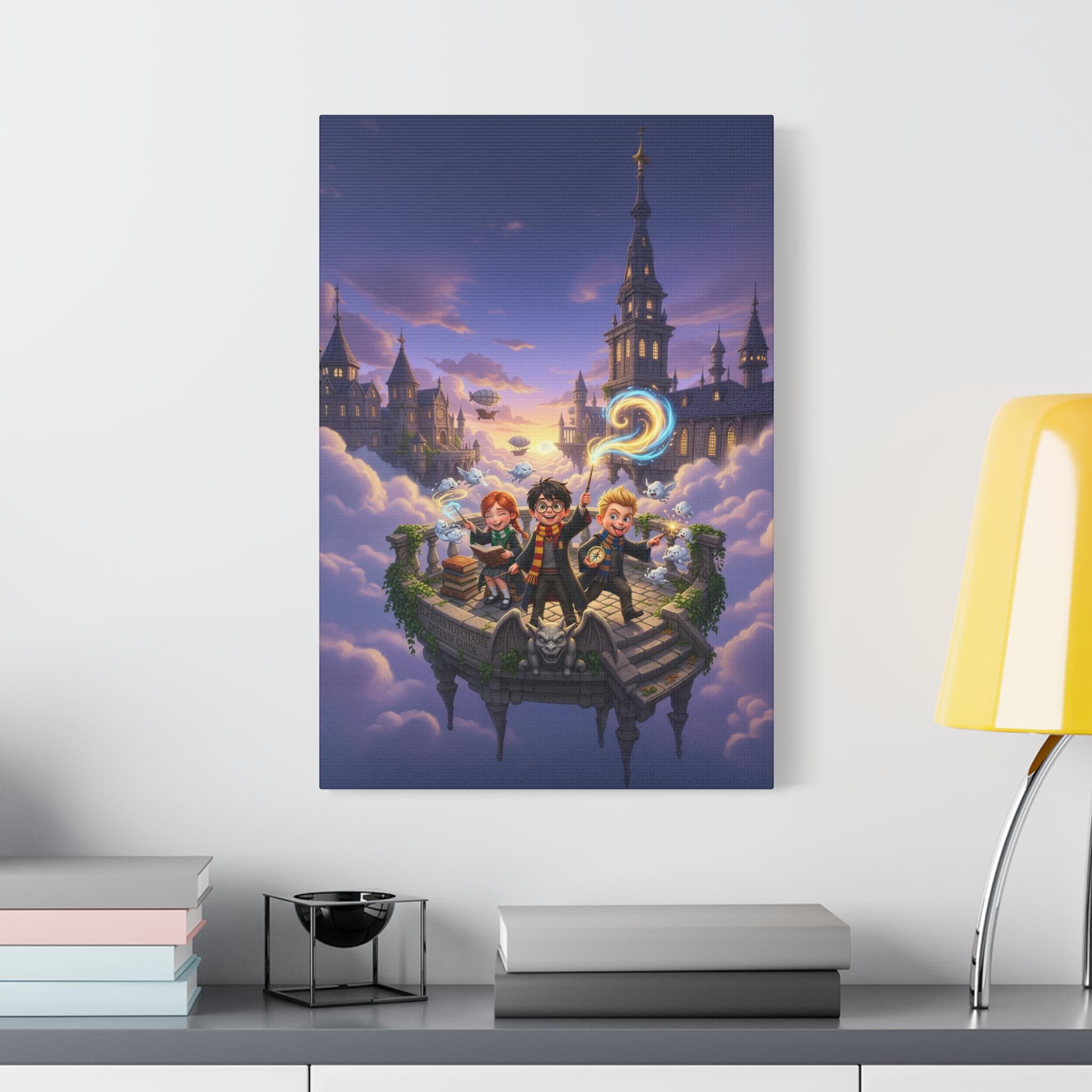 Canvas print that turns a room into a story. Floating above soft lavender clouds, a band of wide-eyed adventurers strides toward a glowing question-mark sigil, steps sinking into ivy-twined stone while a spired city glows behind them. The satin-semi-gloss surface keeps colors deep and luminous — dusky purples, warm golds, and emerald greens — so every tiny detail in the illustration reads crisp from across the room. Light catches the subtle sheen of the polycotton for an almost-painterly finish. Mounted on a fine New Zealand pinewood frame and shipped with a simple self-assembly hanging kit, this canvas arrives ready to hang in horizontal, vertical, or square arrangements and in multiple sizes to suit bedrooms, studios, or cozy reading nooks. It feels like a window into a twilight world made for late-night planning, game sessions, or a collector’s gallery wall.