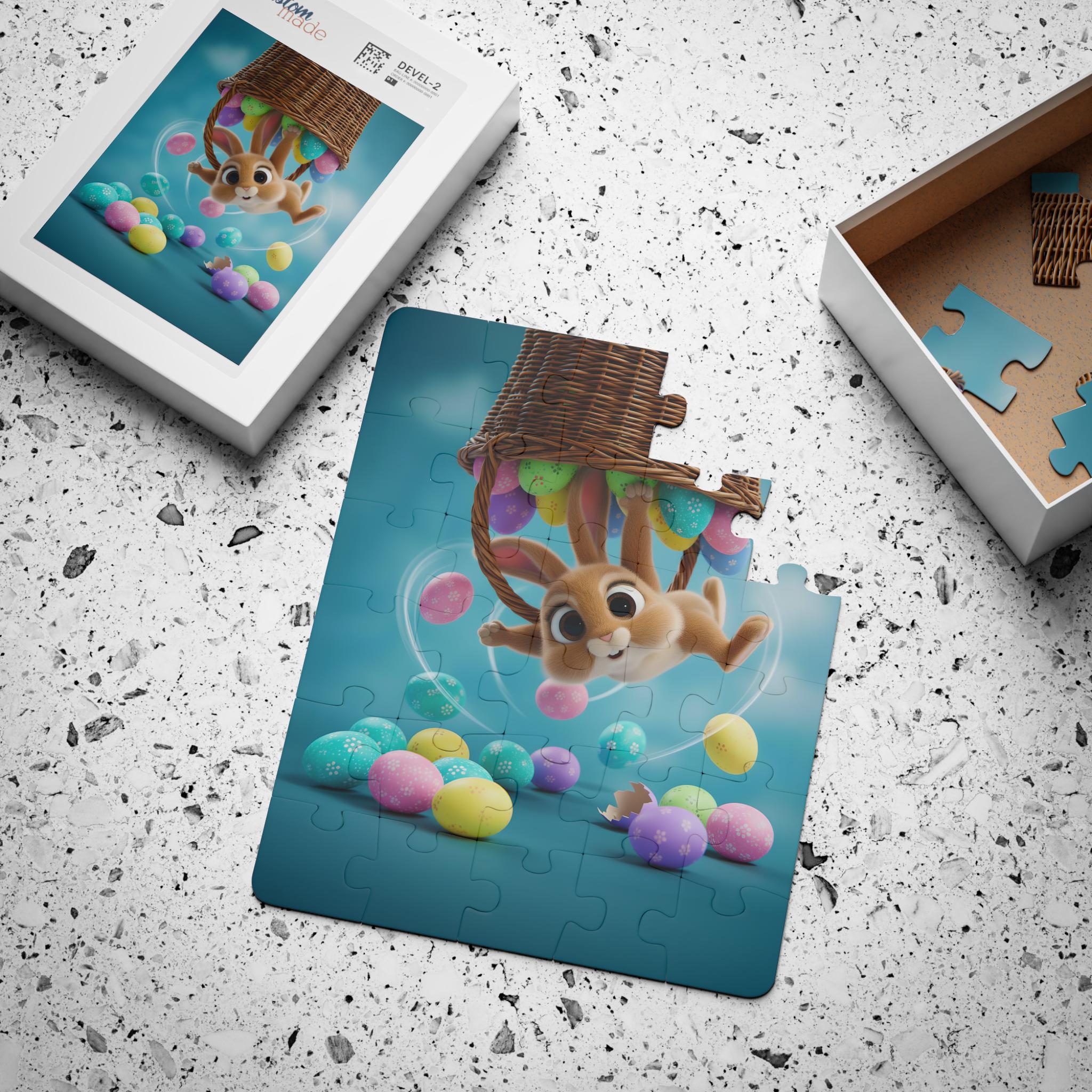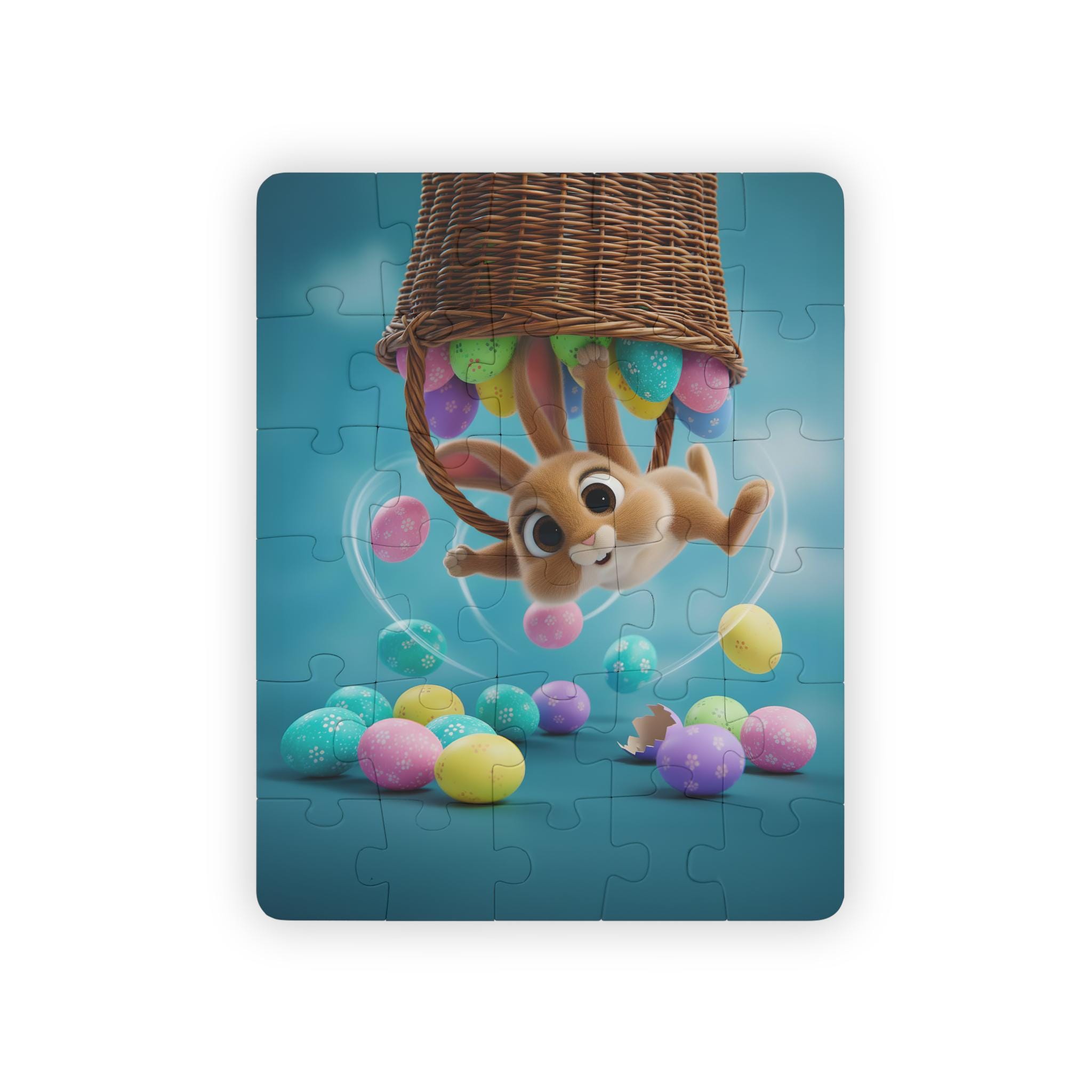 This bright 30-piece children’s puzzle brings a playful Easter scene to little hands. A mischievous bunny tumbles from a wicker basket as colorful eggs scatter across a soft teal backdrop. Large, rounded pieces are easy for small fingers to grasp and reassemble, and the sturdy laminated chipboard holds up to repeated play. The puzzle arrives in a box printed with the full image so kids can match colors and shapes while building confidence and fine motor skills. It sits nicely on a playroom floor or activity table and invites short, focused play sessions that end with a grin.