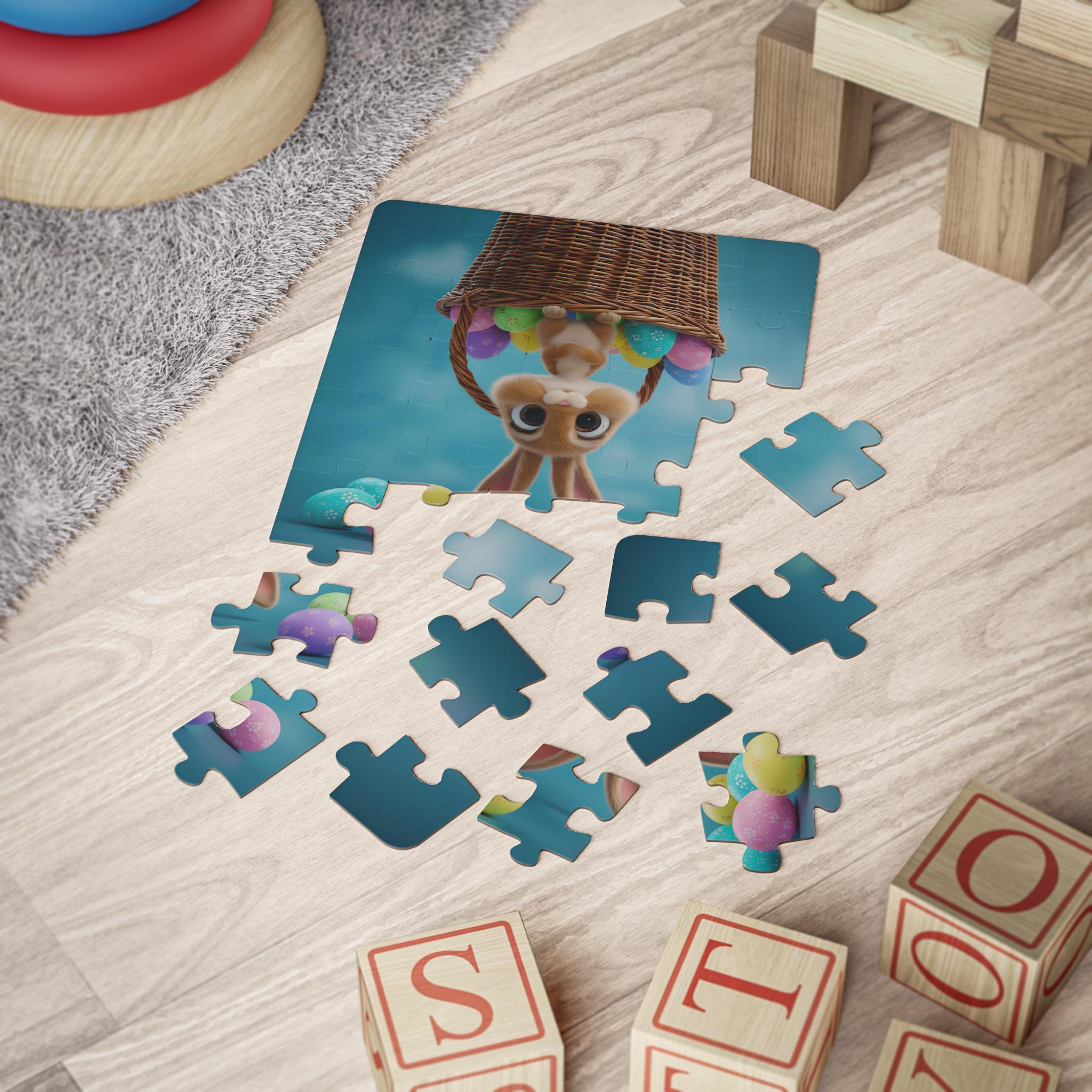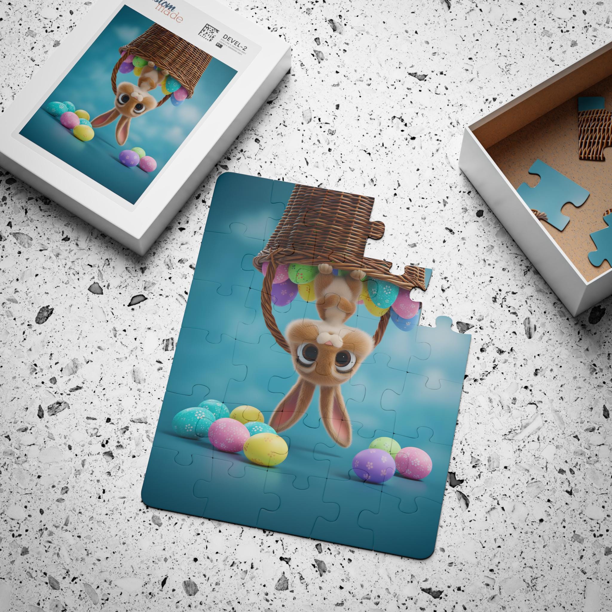Bright, playful 30-piece puzzle designed for little hands and big imaginations. Each laminated chipboard piece is chunky with rounded corners, making assembly safe and comfortable for toddlers and preschoolers. The cheerful scene — a curious bunny peeking from a tipped basket among colorful Easter eggs — invites quiet focus, storytelling, and hands-on learning. The puzzle arrives in a box printed with the full image so children can match colors and shapes as they build. Lightweight but durable, it withstands repeated play and makes rainy afternoons, playdates, or holiday activity baskets more joyful.
