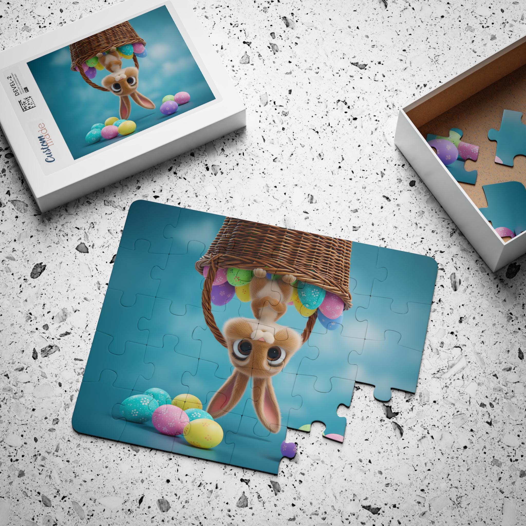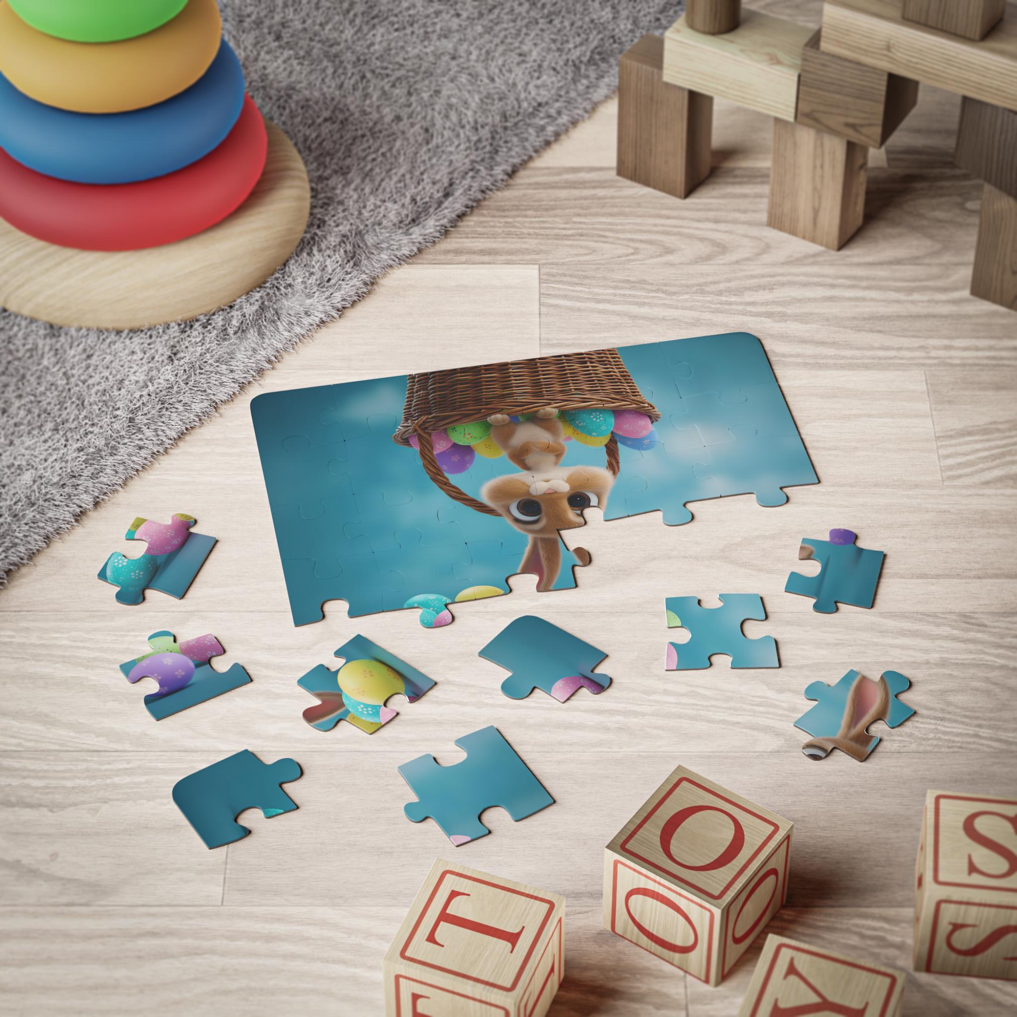 This 30-piece kids' puzzle brings playful wonder to little hands. Bright, laminated chipboard pieces are large and lightweight, with rounded corners that make assembly easy and safe. The scene — a curious bunny peeking upside-down from a wicker basket amid colorful eggs — sparks imaginative play and short storytelling sessions. The included box shows the full image for reference and keeps pieces tidy between playtimes. It slips effortlessly into quiet afternoons, family game moments, or holiday activity baskets, inviting small builders to practice focus, hand-eye coordination, and patience while smiling through each completed piece.