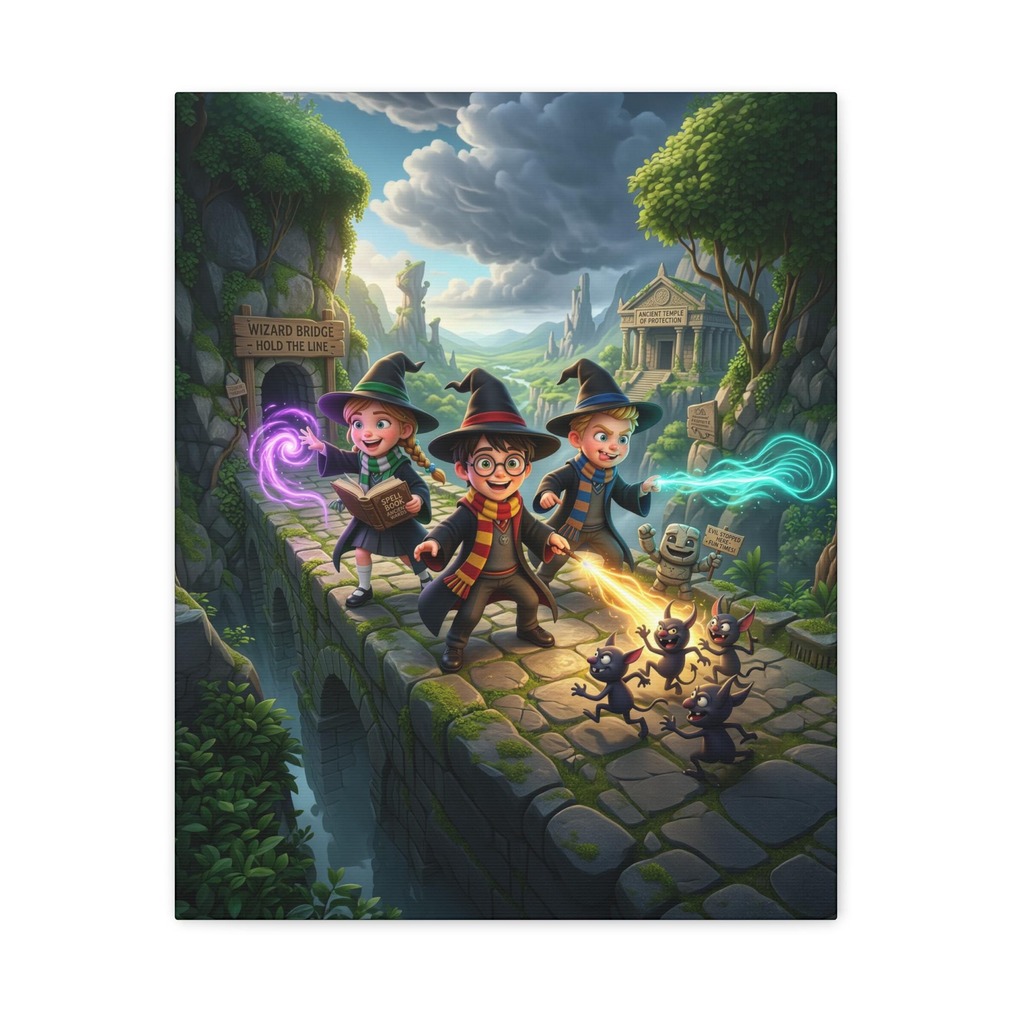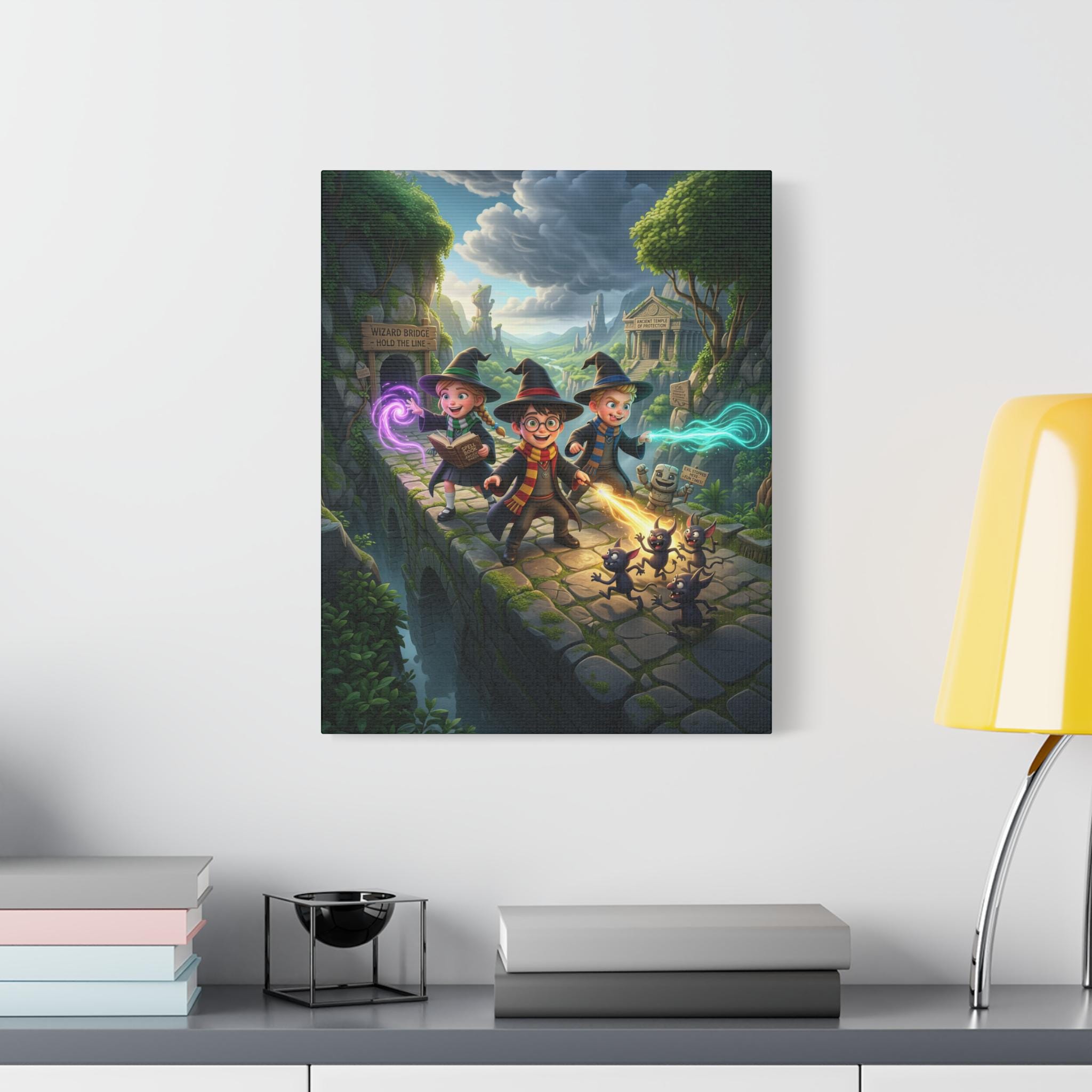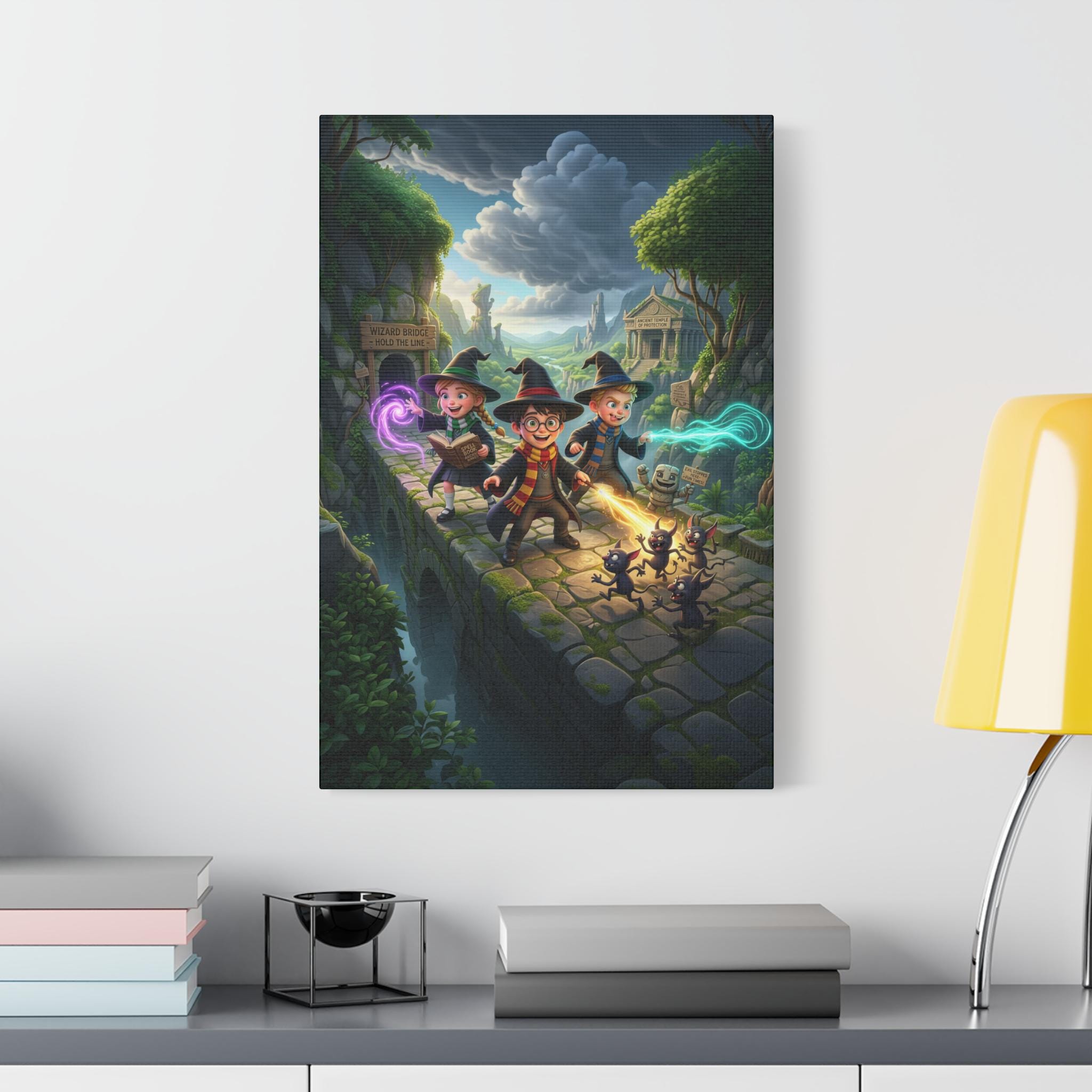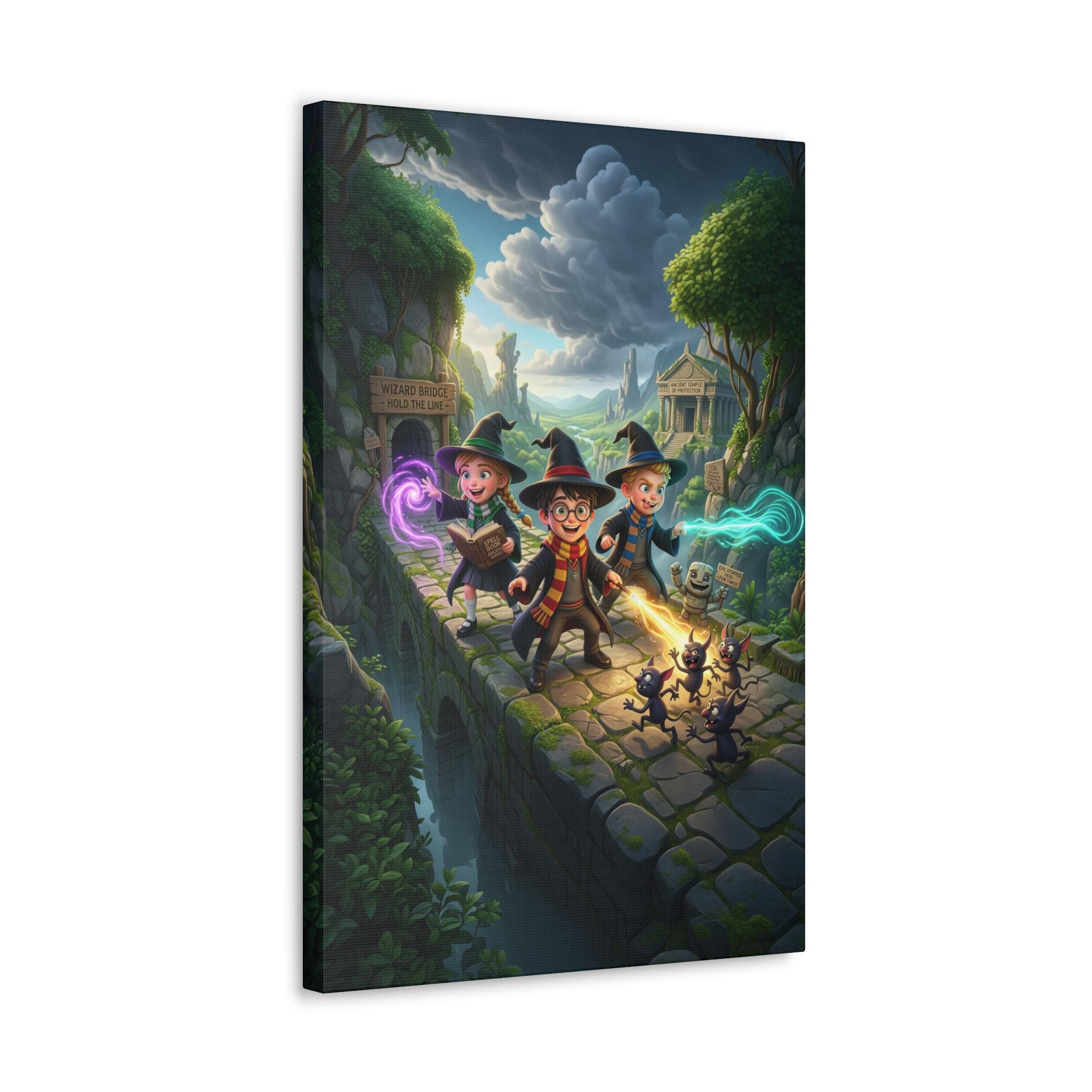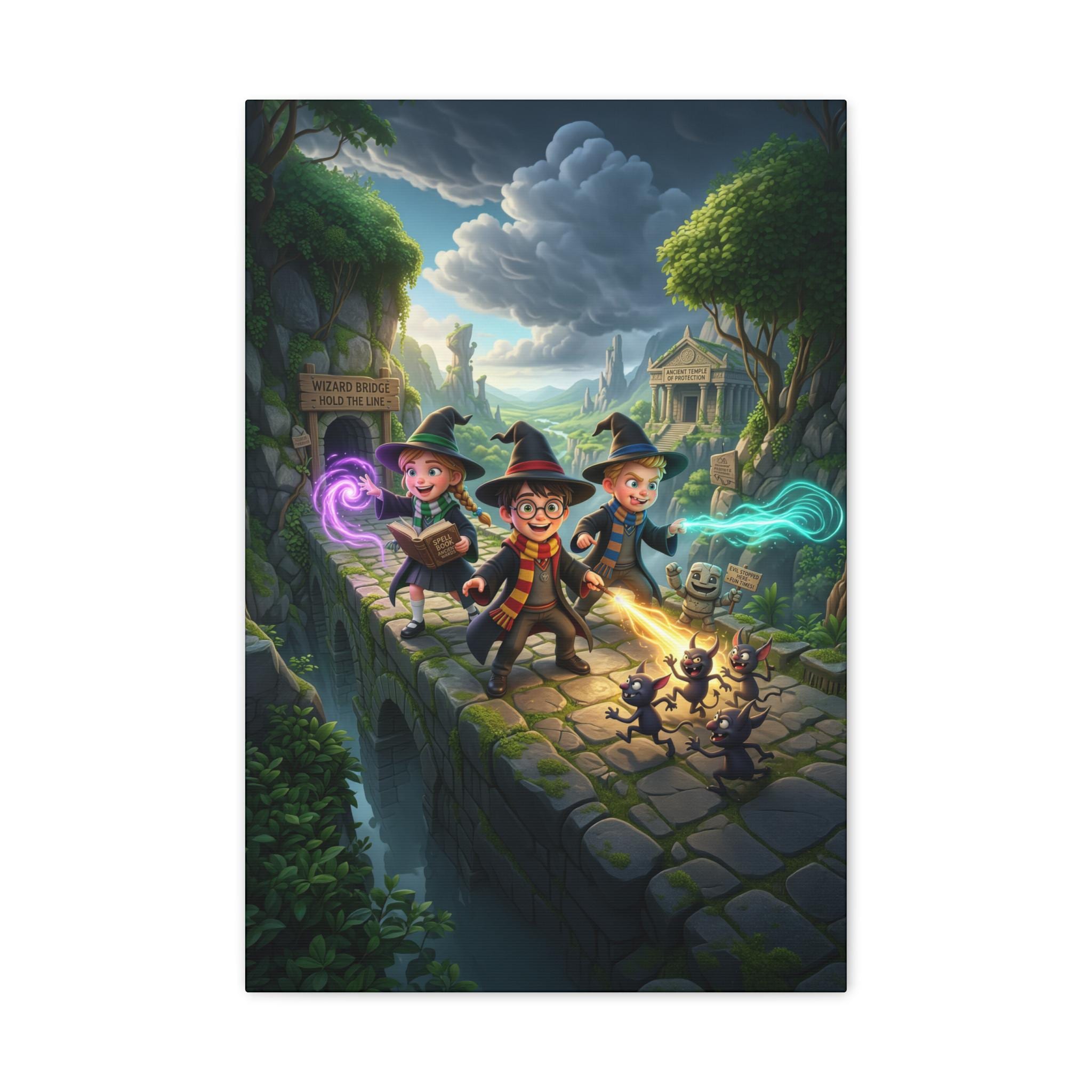 A richly detailed canvas print that brings a whimsical fantasy adventure to your walls. Painted in vivid jewel tones with a semi-gloss satin finish, this stretched polycotton canvas captures three young wizards racing across an ancient stone bridge, soft magical auras trailing from their wands while curious shadow-creatures skitter behind. The New Zealand pinewood stretcher frame and professional Epson printing give the scene depth and crisp color — it reads like a still from a beloved storybook and sparks imagination in any room. Lightweight yet sturdy, it arrives with a simple self-assembly hanging kit so it’s ready to display in a nursery, reading nook, or game room where tales and play come alive.